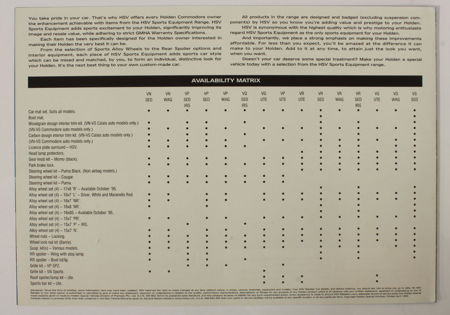 - New Original VS HSV 1995 Sports Equipment Brochure 4/1995